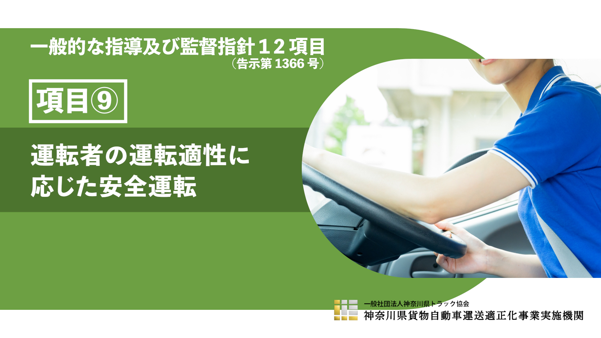 この教育動画は、一般的な指導及び監督指針12項目(国交省告示第1366号)の中の項目⑨「運転者の運転適性に応じた安全運転」です。